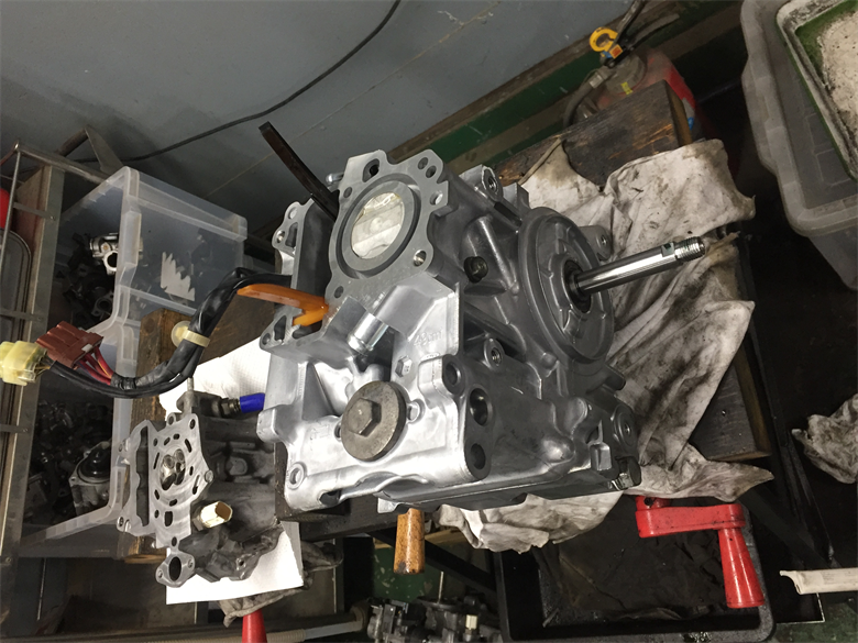 シリンダーヘッドとクランクケースを組みつけ後ラジエター等、補器類を取り付けテストベンチでテストとなります